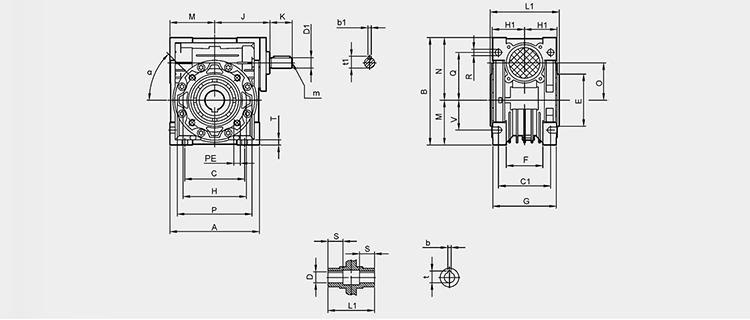 | NRV | P | Q | R | S | T | V | PE | b | b1 | t | t1 | m | α | Kg |
